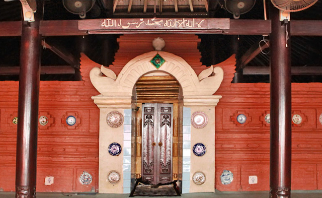 Dilihat dari bentuk kubahnya, memang tidak terlalu istimewa karena bentuknya hampir sama dengan rata-rata masjid kuno di seluruh Nusantara, yakni berkubah limas (piramida). Tetapi, jika Anda masuk ke dalamnya maka akan Anda jumpai corak arsitektur yang didominasi warna Tiongkok. Seluruh dinding masjid dihiasi porselen buatan Tiongkok yang berbentuk piring warna merah danbiru. Konon, hiasan piring-piring porselen itu dibuat pada masa Dinasti Ming.